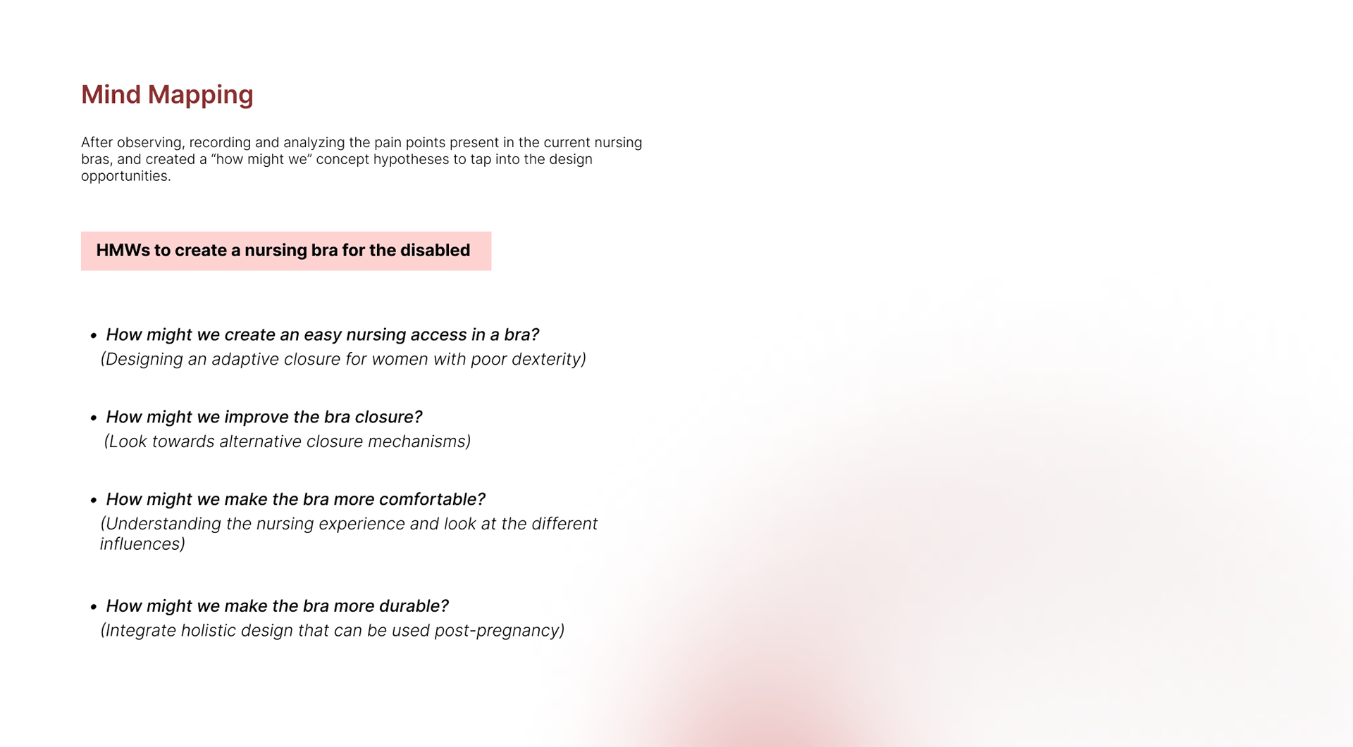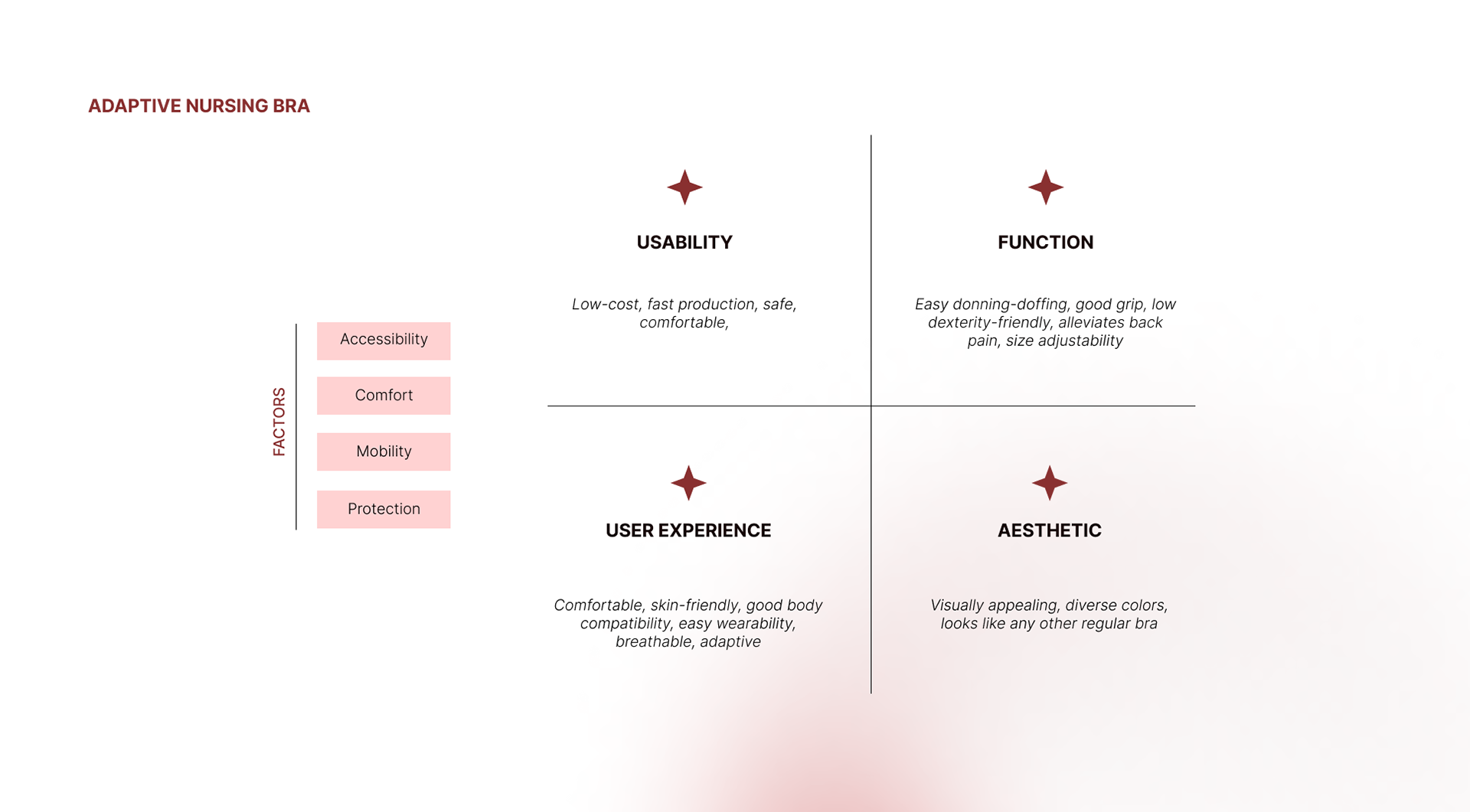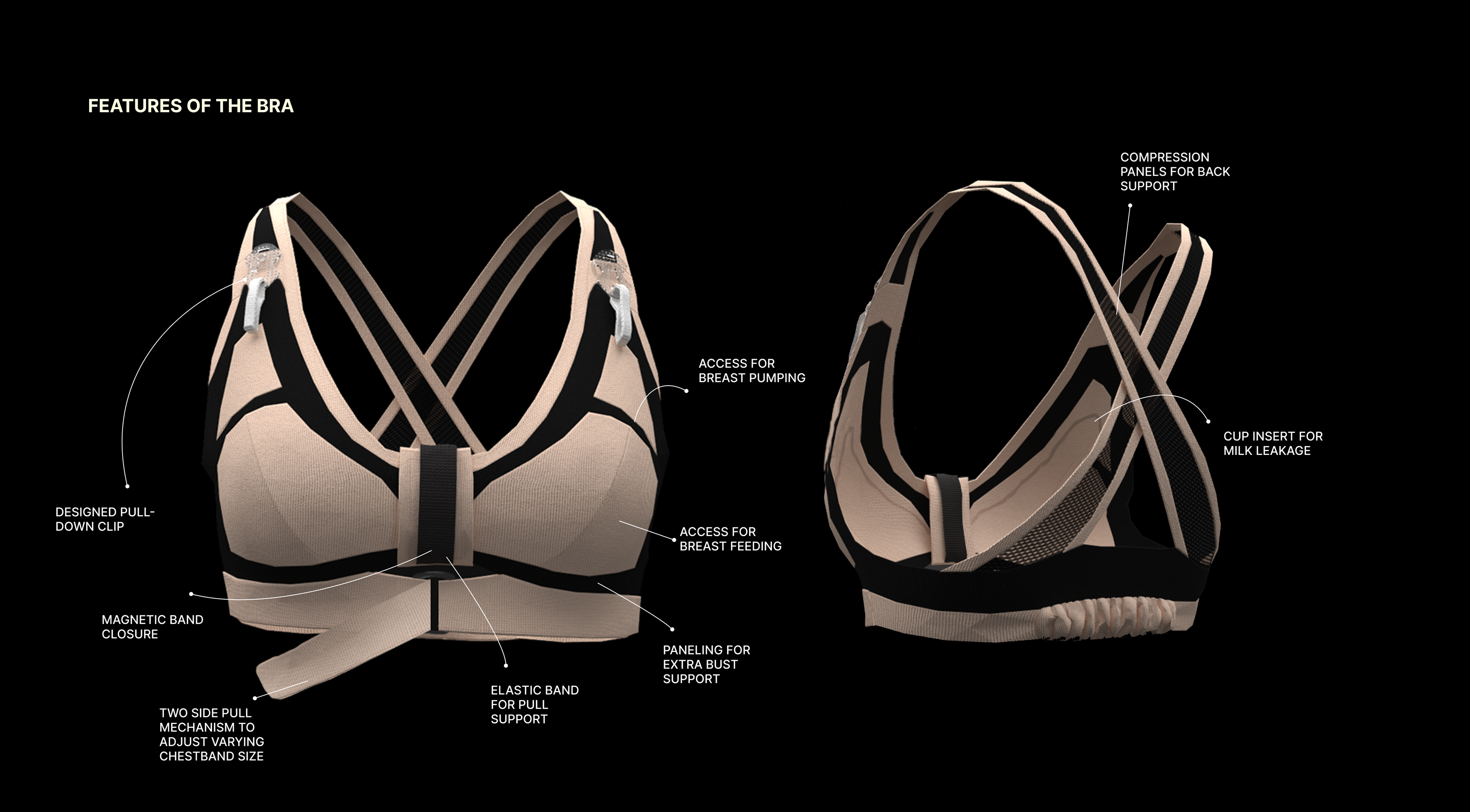 This project explores the unaddressed need for accessible and aesthetically pleasing nursing lingerie designed specifically for women with physical disabilities. The focus lies on developing an adaptive bra that prioritizes user-friendliness. I explored the arena of haptic closures for those with dexterity limitations and posture-correcting mechanisms to enhance both comfort and functionality.